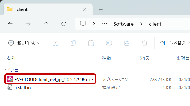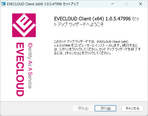 - 管理者が配布したデータからEVECLOUD クライアントのインストーラー(EVECLOUDClient_x64_jp_x.xx.x.xxx.exe)を実行してインストールを開始します。