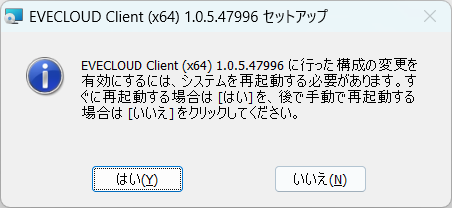 - EVECLOUD クライアントのインストールが完了するとWindows の再起動を行うメッセージが表示されるのでメッセージに従ってWinodws 端末の再起動を行います。