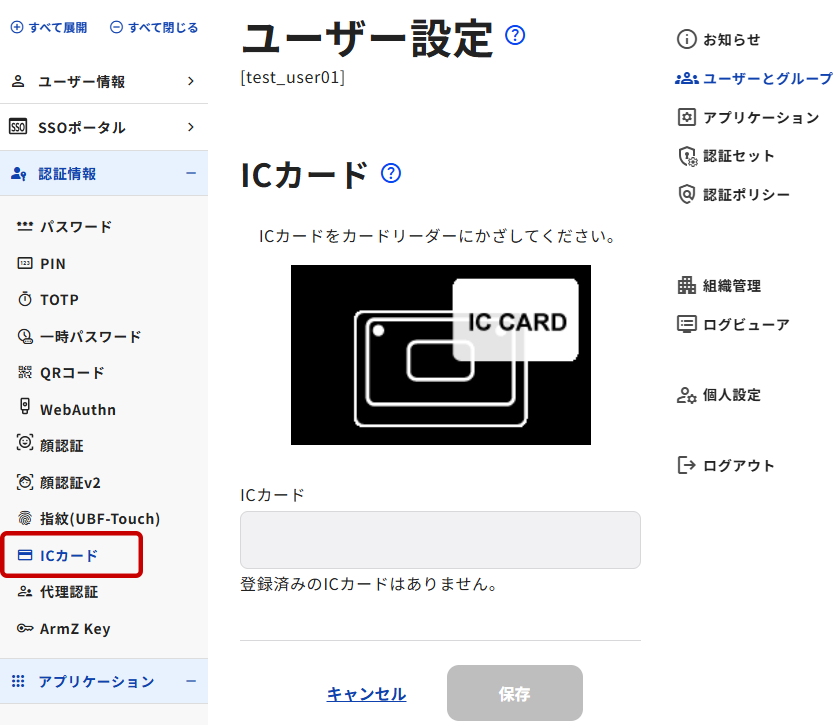 - 「ユーザー設定」ページにて、左メニューの[ICカード]を選択します。※メニューが閉じている場合は[認証情報]をクリックして開きます。