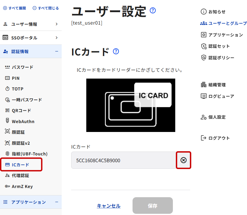 - ユーザー(個人)設定画面にて、左メニューの[ICカード]を選択し、ICカード設定画面を表示します。「ICカード」欄にある アイコンで登録情報を削除します。